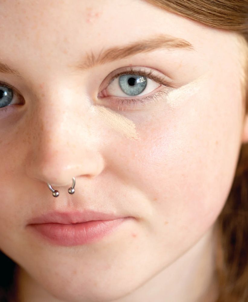 2. With fingertips or a precision brush, deposit and blend to even out skin tone and colour correct other areas of the face.