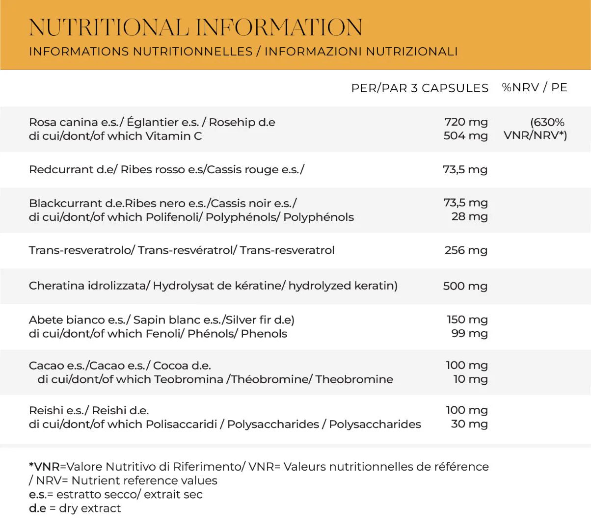 Rosehip (Rosa canina L.) fruit extract (titrated to 70% in Vitamin C) 720mg; Redcurrant extract(Ribes rubrum) 73,5mg; Blackcurrant extract (Ribes nigrum) 73,5mg; Polygonum cuspidatum (Reynoutria japonica) root extract (titrated to 98% in trans Resveratrol)256mg; Hydrolyzed keratin 500mg; Silver fir branch extract (Abies alba Mill.) 150mg; Cacao (Theobroma cacao L.) seed extract (titrated to 10% in Theobromine) 100mg; Reishi (Ganoderma lucidum (Curtis) P. Karst.) extract (titrated to 30% in Polysaccharides) 100mg.